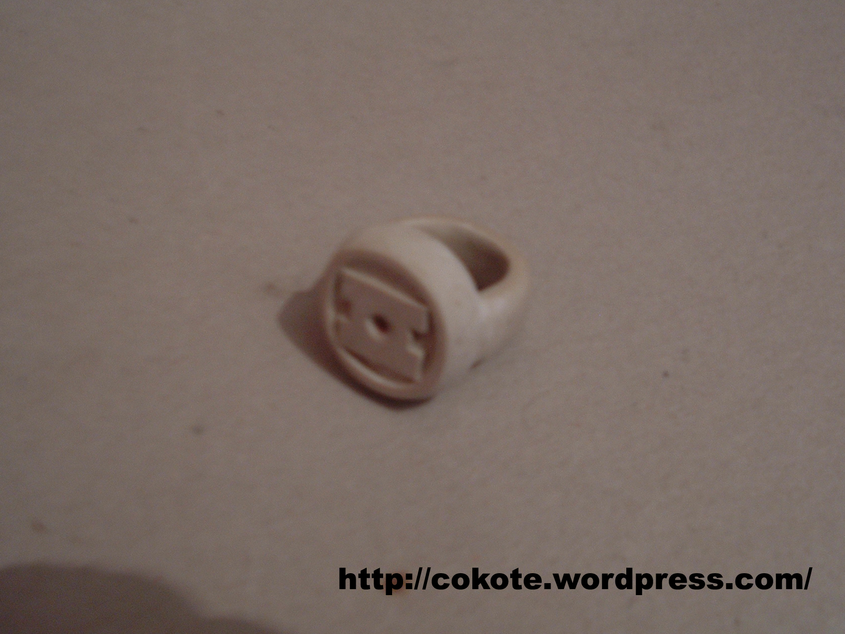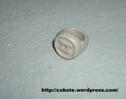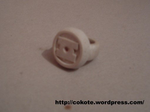 Ahora sí se parece más al anillo, 🙂 Luego del primer tiempo de fraguado (Las tres horas) corregí los detalles, lijando, limando y cortando con un exacto (Cutter o cuchillo cartonero) el anillo y fue necesario agregar más material para dejar el logo lo más parecido posible.