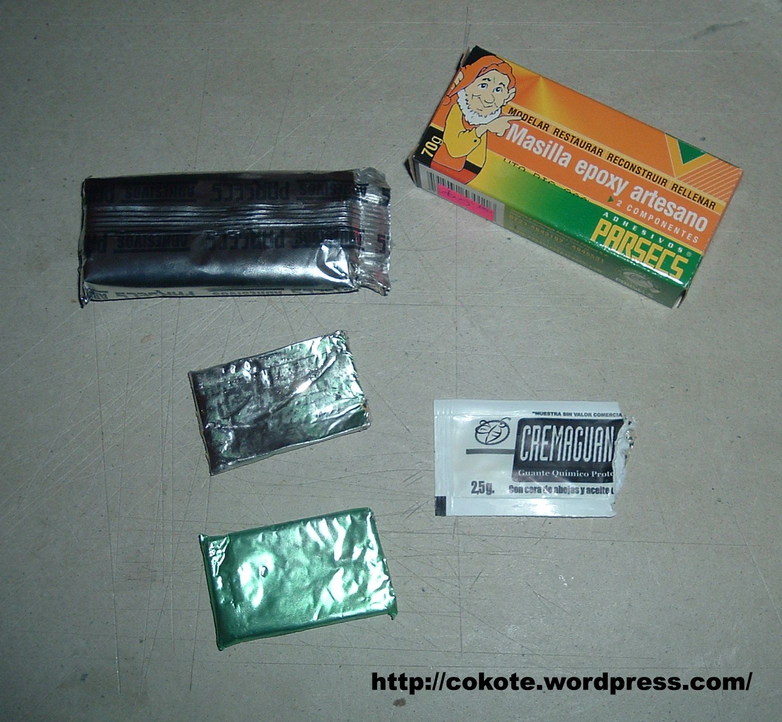 Conseguí esta: «Masilla epoxy artesano» de adhesivos parsecs, la cual trae una crema para manos. Es muy importante mencionar que la masilla epóxica tiene sus «batitrucos» para trabajarla.