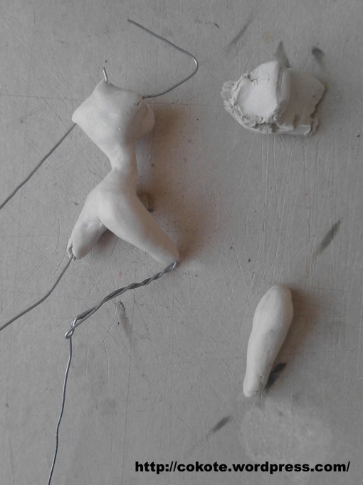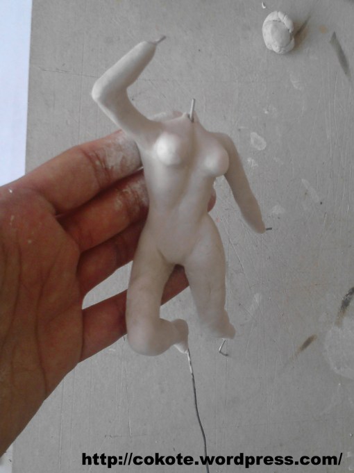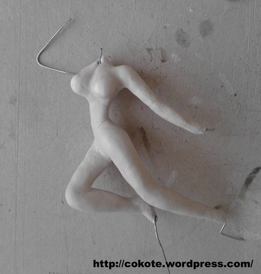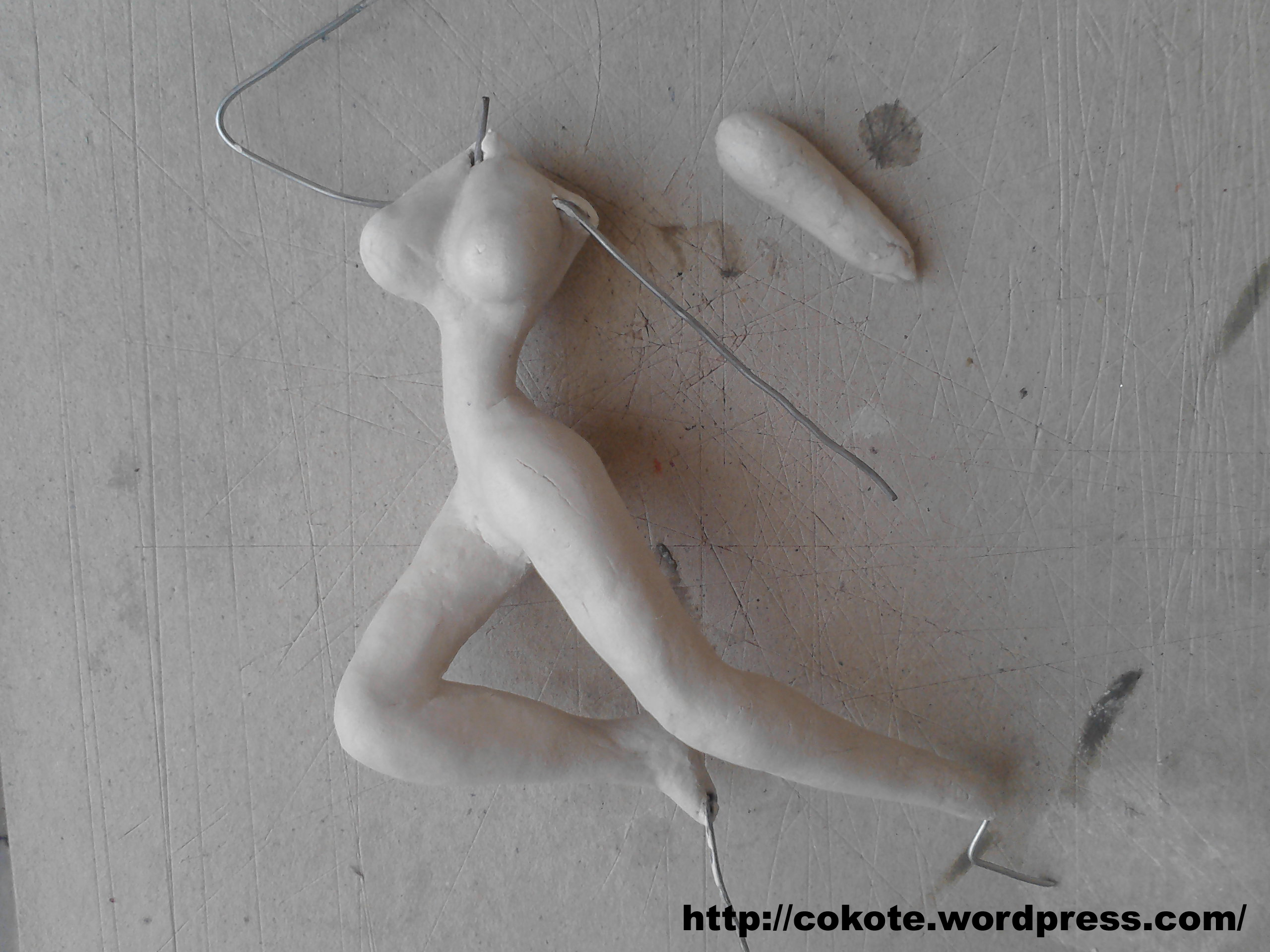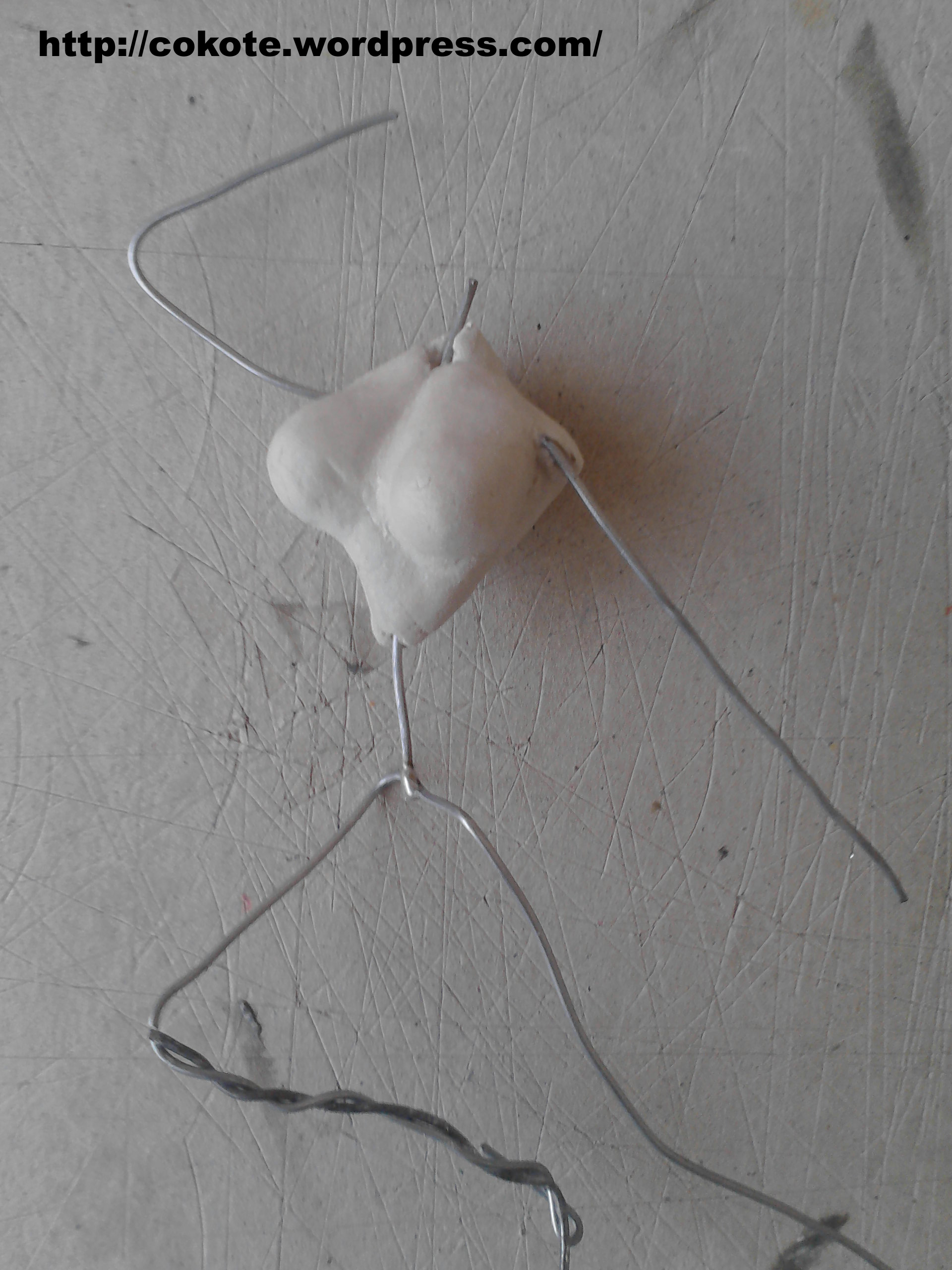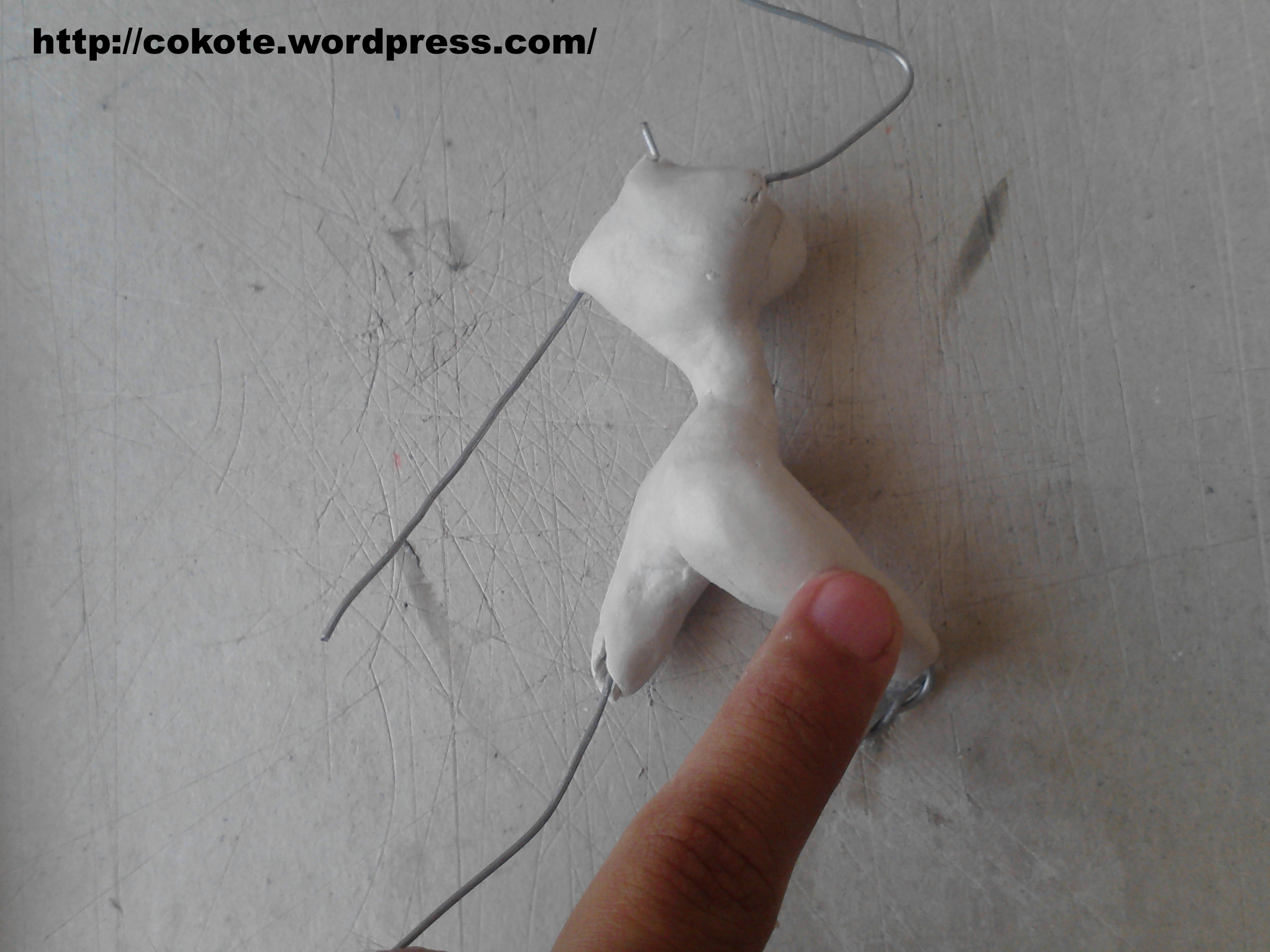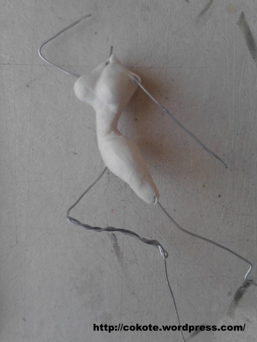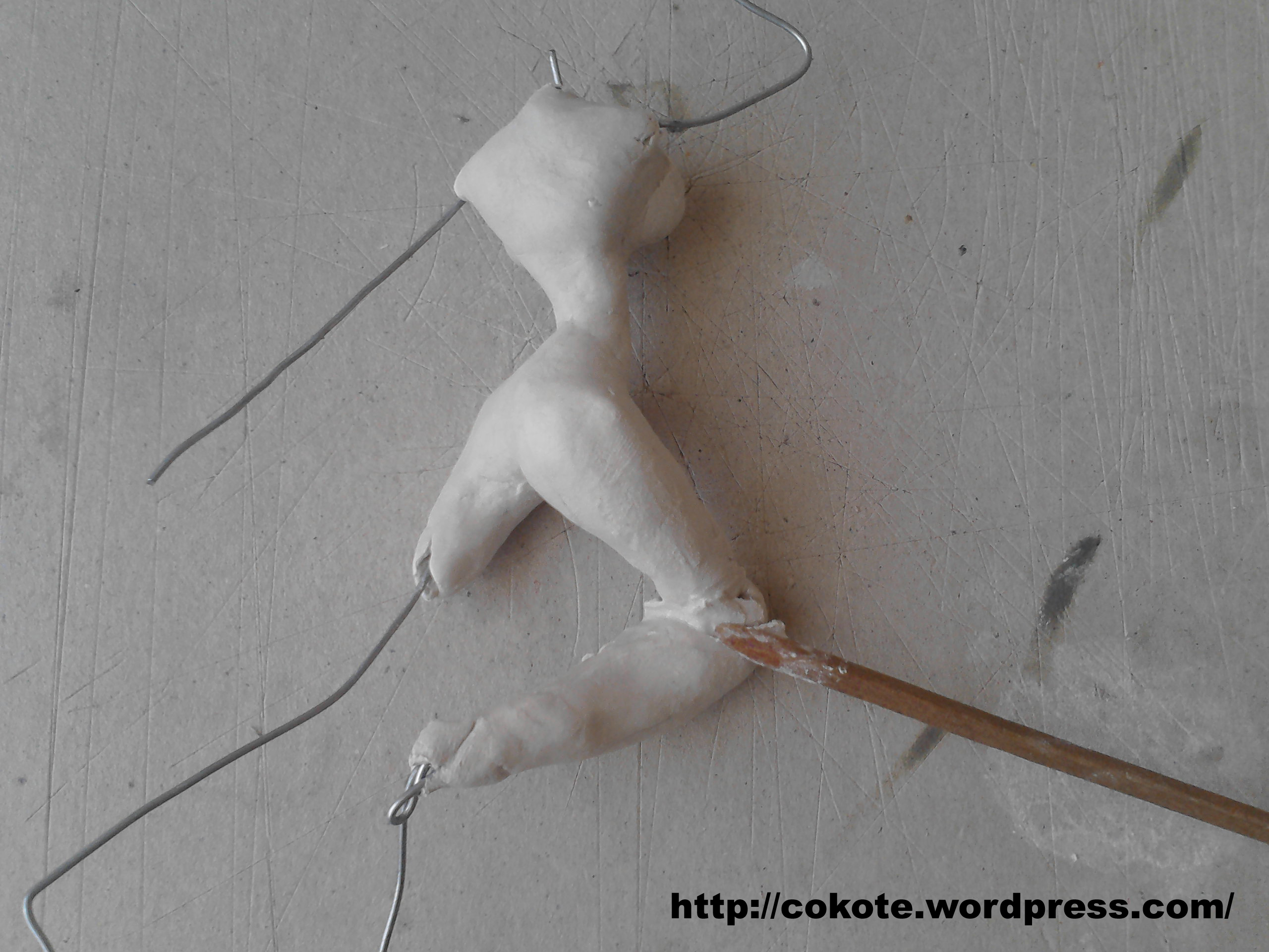 Bueno… ya está tomando forma, pero solo es su forma básica, ya que es sobre la cual trabajaré después, una vez seca. Ahora sigo con los brazos, de la misma forma que las piernas utilizo el «garrote» como base de la estructura (ya ni sé cuántas veces he escrito esa palabra XD)