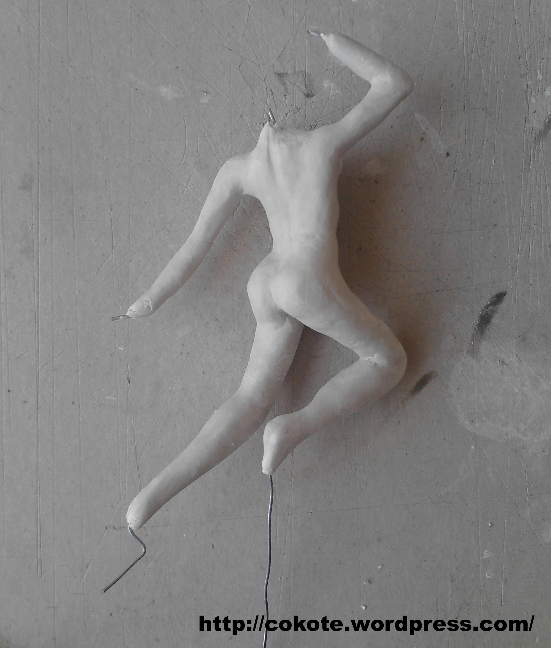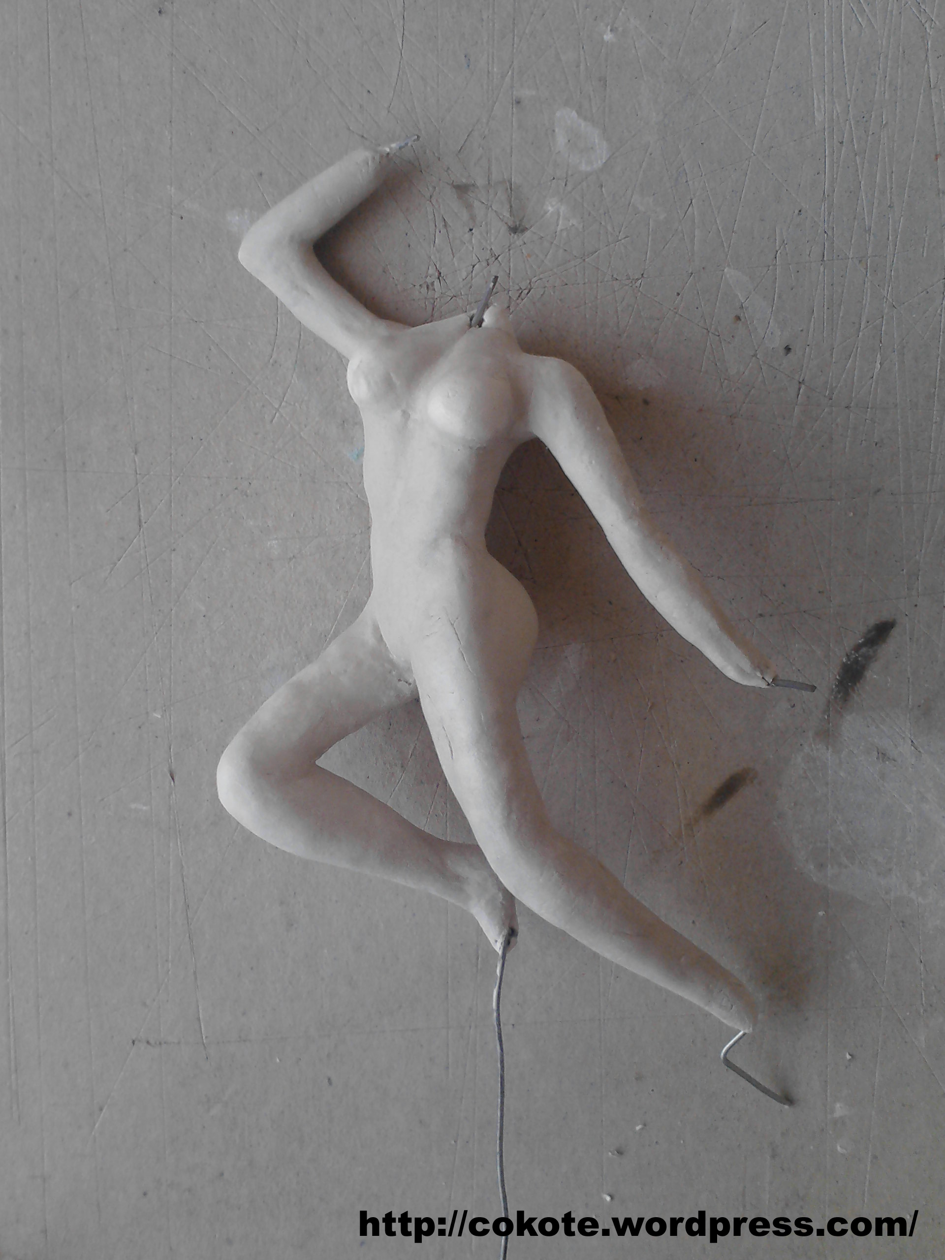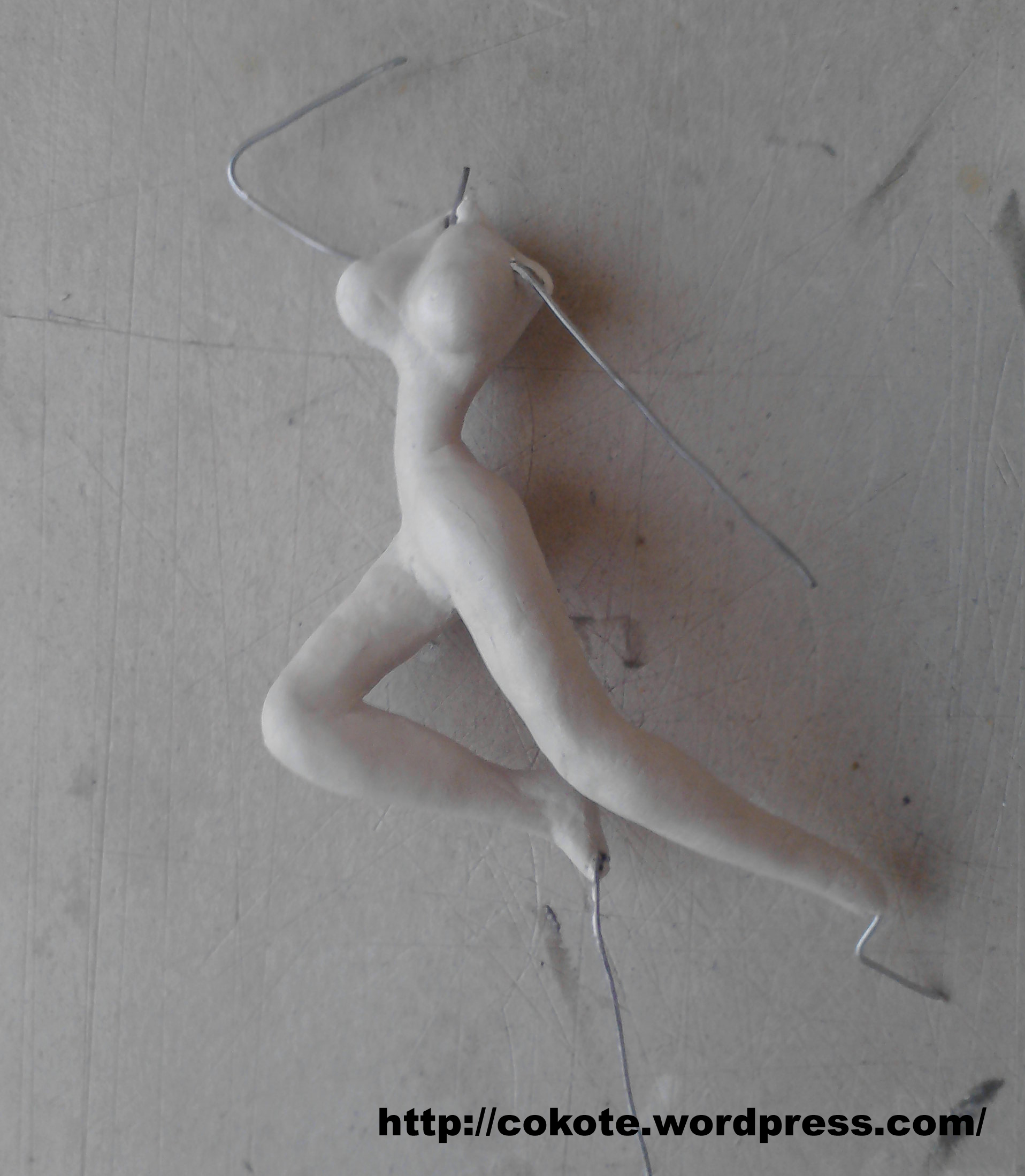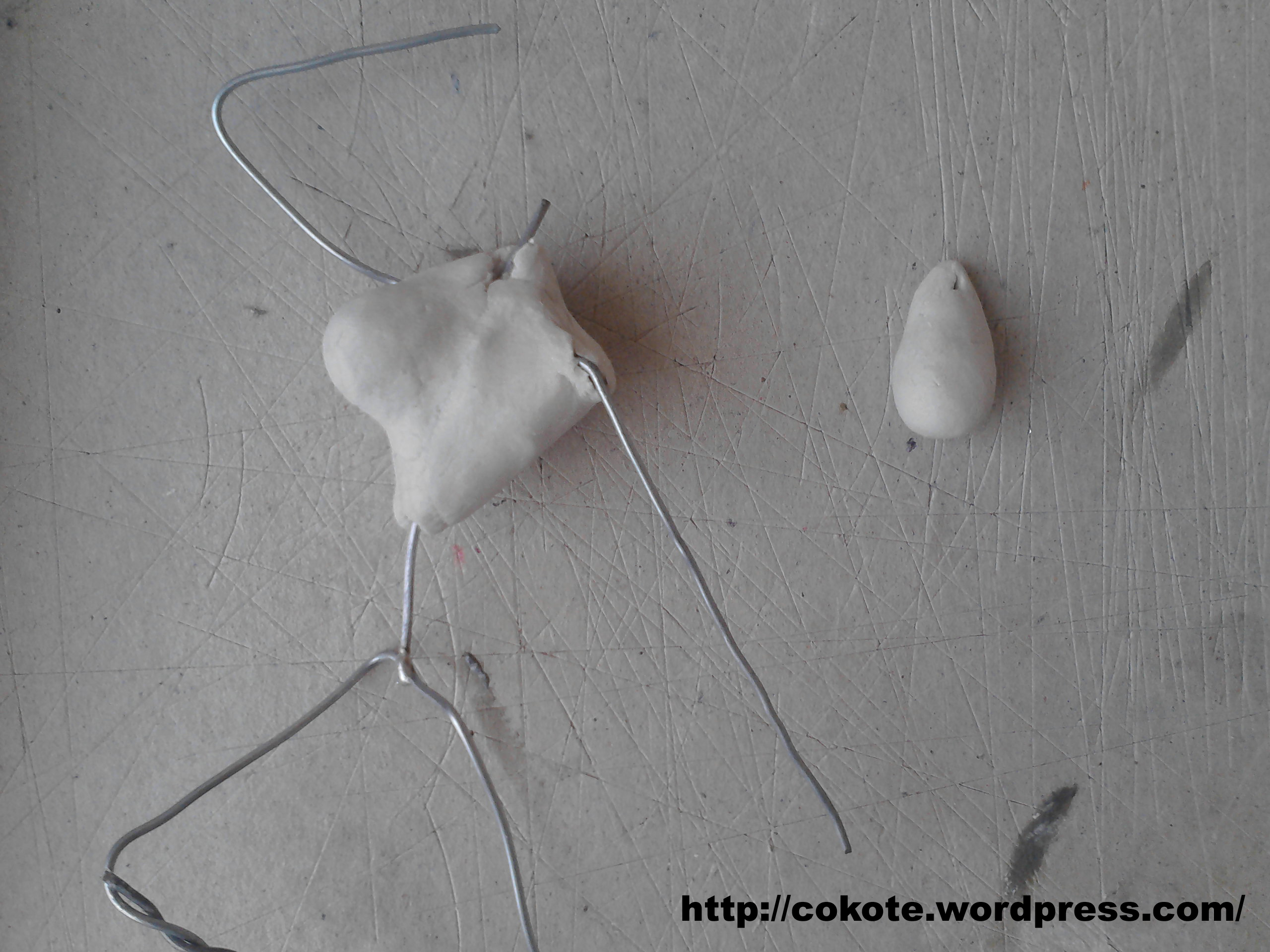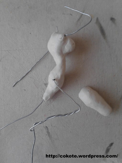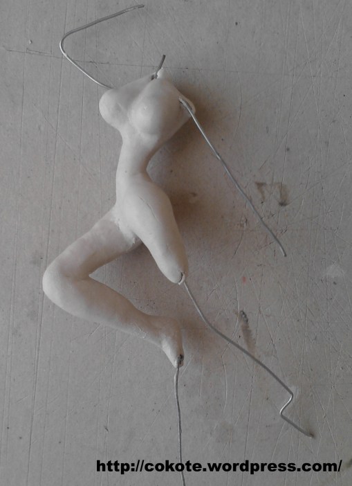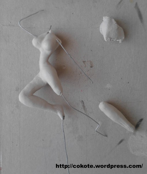 Bueno… ya está tomando forma, pero solo es su forma básica, ya que es sobre la cual trabajaré después, una vez seca. Ahora sigo con los brazos, de la misma forma que las piernas utilizo el «garrote» como base de la estructura (ya ni sé cuántas veces he escrito esa palabra XD)