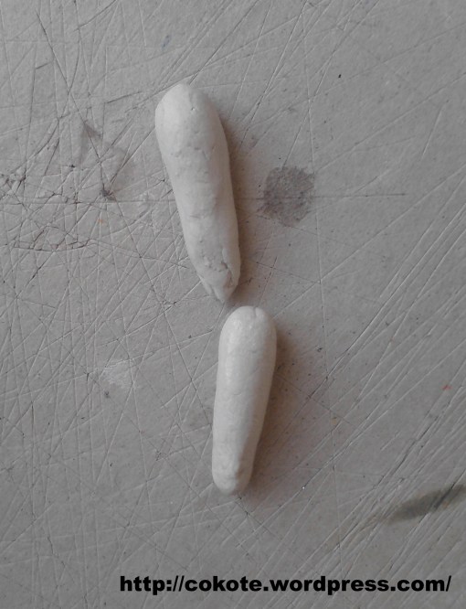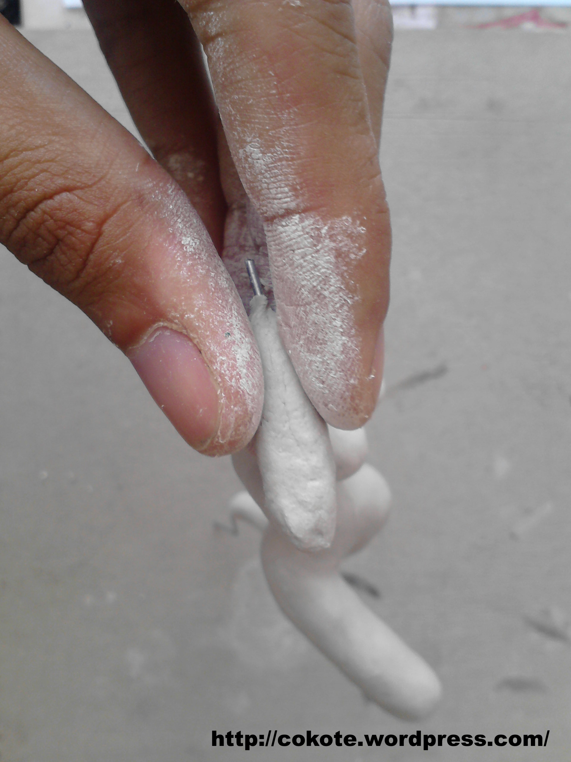 En la foto superior se ve como puse especial cuidado a las uniones de los «garrotes» en las rodillas, pues esta sección de la figura (de muchas en realidad) sufre mucho con el esfuerzo, soporta gran parte del peso y tiende a fatigarse y quebrarse, recuerden que mencioné que la pasta das puede ser quebradiza así que como las rodillas son delgadas me preocupé de que quedaran muy bien unidas y adheridas las dos secciones que la formaron.