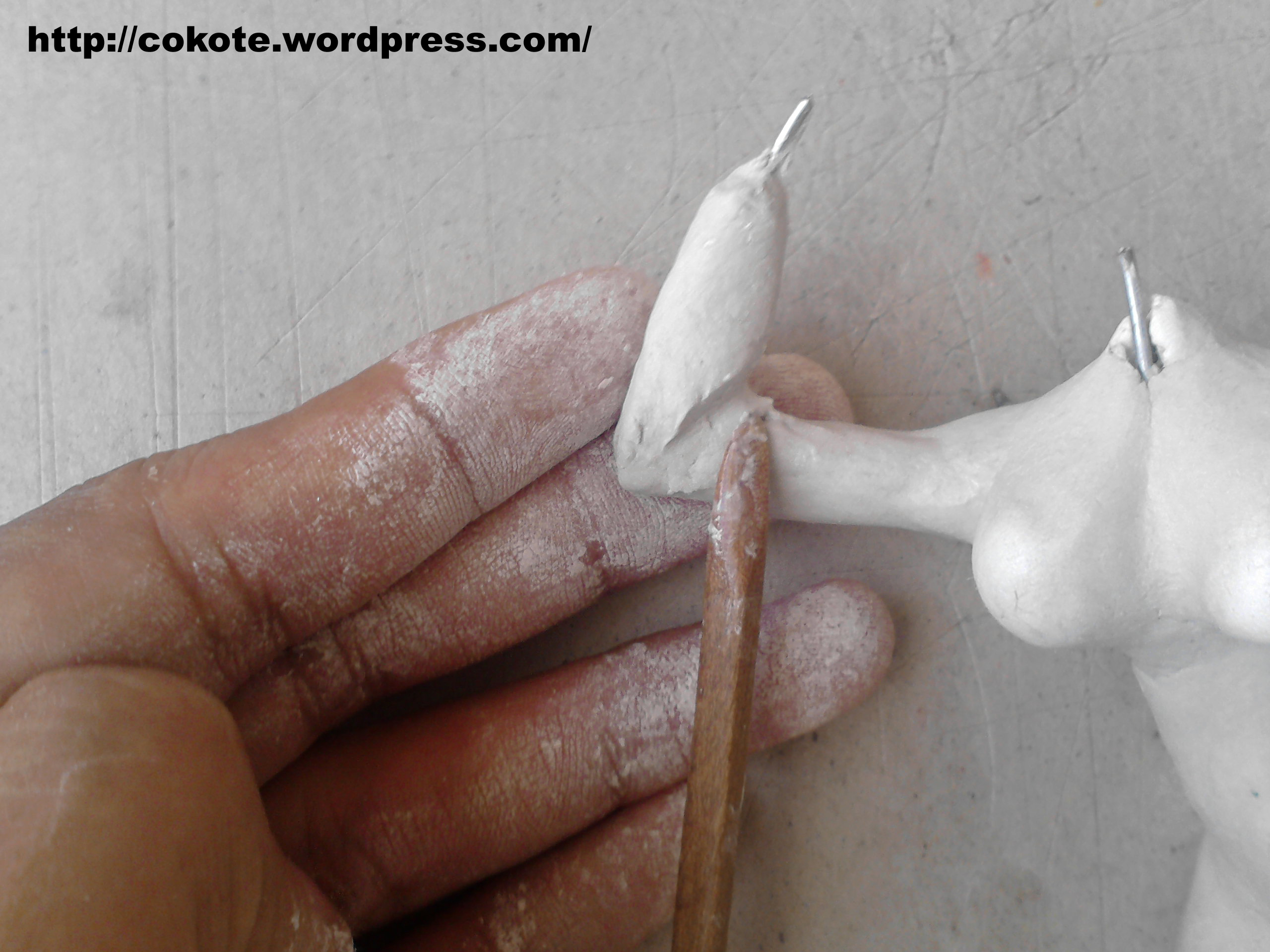 Es exactamente la misma técnica que utilicé para las piernas, y como en las rodillas, aquí puse especial cuidado con la unión del hombro y la unión del codo, asegurándome que queden bien adheridas humedeciendo la masa.