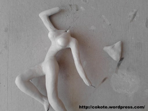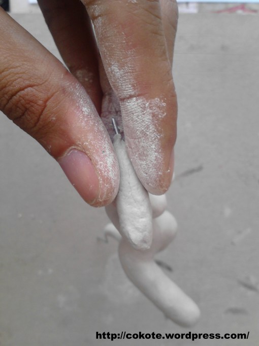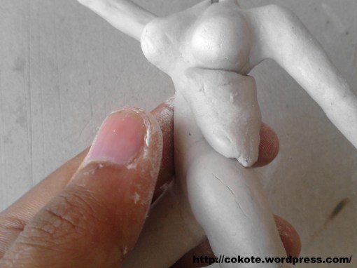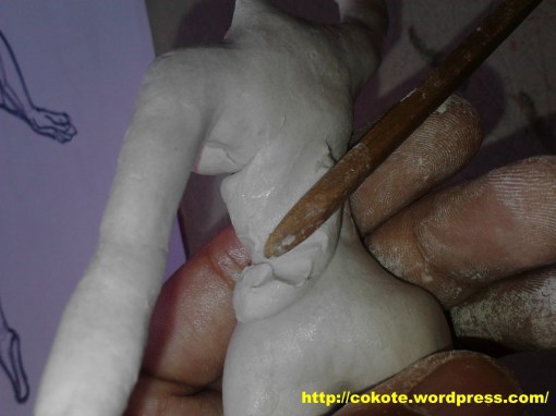 La parte más ancha de este «garrote» servirá también para modelar el trasero, ya que en este caso lo estoy usando para modelar los muslos, así que nuevamente abundante agua y mucha tranquilidad jejejejeje XD para adherirlo e ir suavizando con la esteca la superficie, hay que poner atención al espacio que existe en la entrepierna, de la misma forma que al dibujar, en esta postura es un error omitirlo, quizá esté de más mencionarlo, pero igual XD es algo que tuve en consideración al modelar.