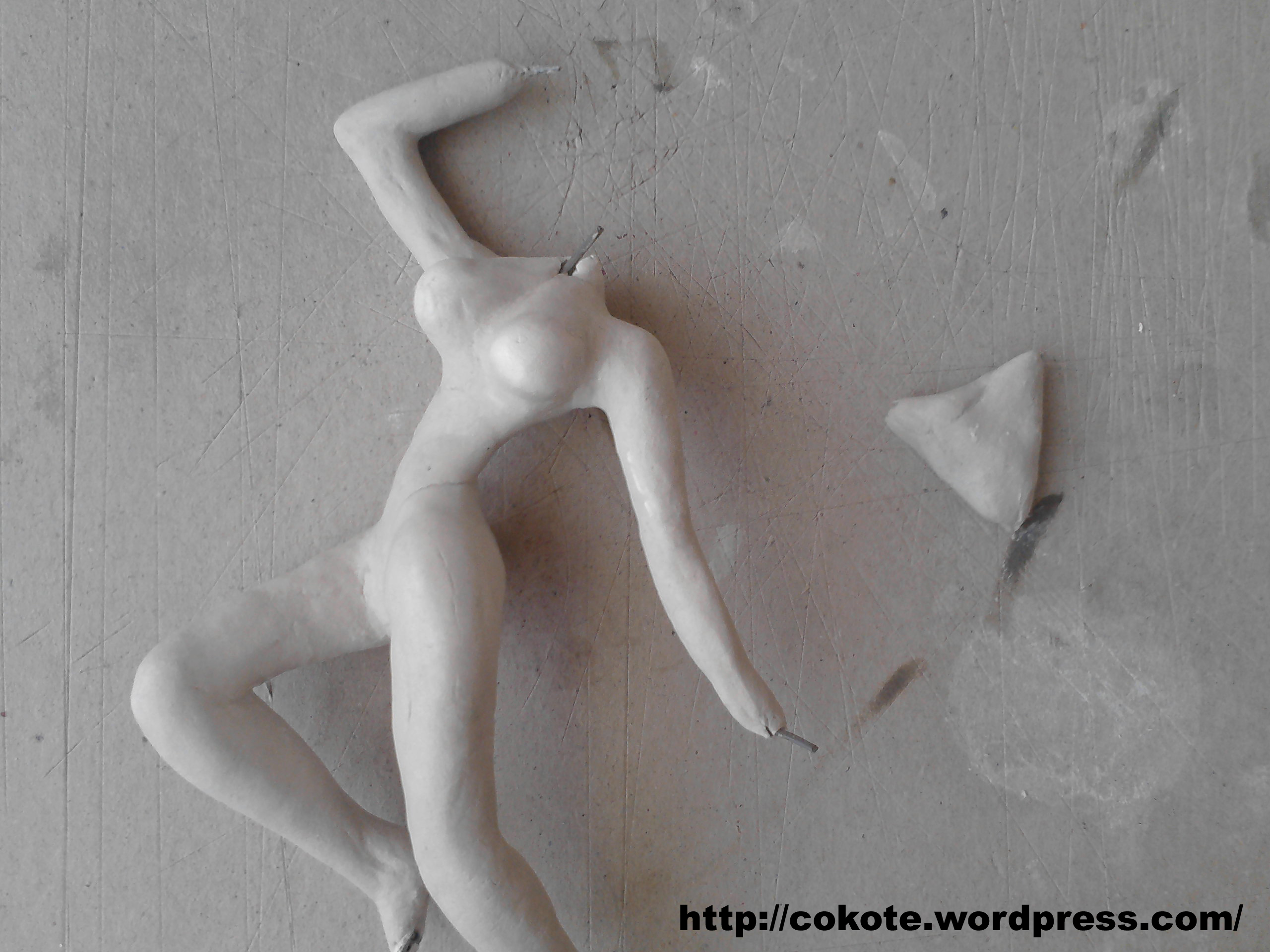 Ya tengo las extremidades listas, ahora agrego un poco más de material a la cadera, la cintura, la espalda, las nalgas, para ello adhiero «triángulitos» bastante humedecidos y con una esteca como cuchillo los voy pegando, similar a trabajar con una espátula XP.