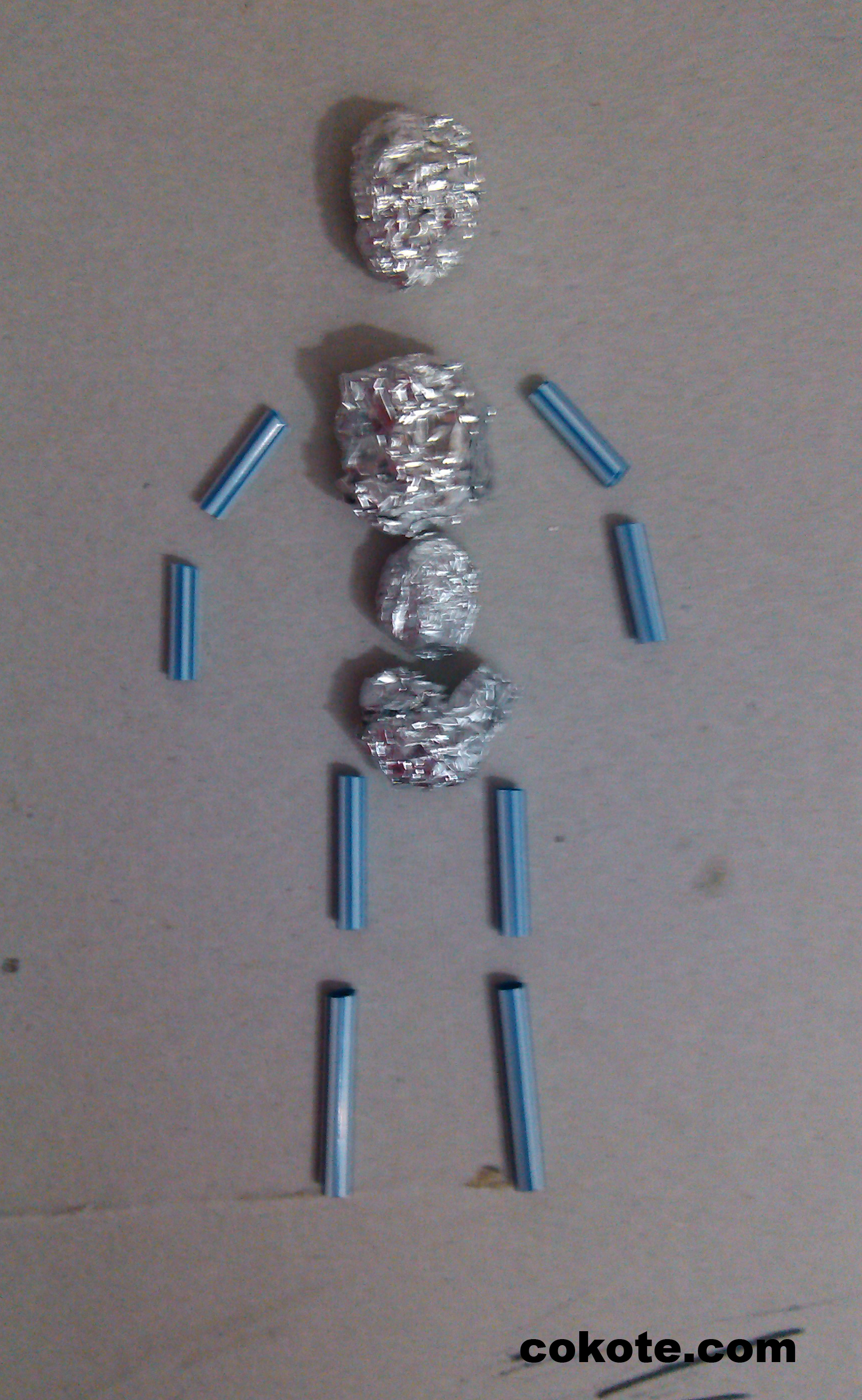 Ya con todas las piezas ahuecadas y con los ganchos puestos, hago la primera prueba de «estabilidad» pasando los elásticos por el interior, la longitud de éstos, para ésta pieza, es de el largo del brazo, para ambos brazos, y para las piernas el largo de una pierna, cada una por separado, entonces tengo tres elásticos, uno del largo de un brazo y dos del largo de una pierna.