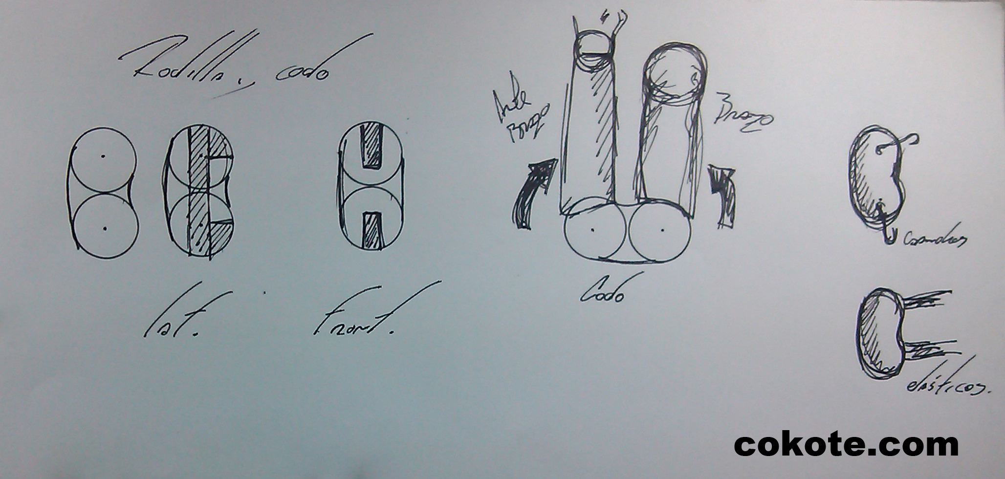 En la imagen de arriba se puede ver que la rodilla es una pieza independiente ( lo mismo el codo) esto es únicamente porque le otorga una amplitud de movimiento mayor a que si solo fuera una esfera, la verdad de las cosas es que tanto el codo como la rodilla es una pieza conformada por dos esferas unidas.
