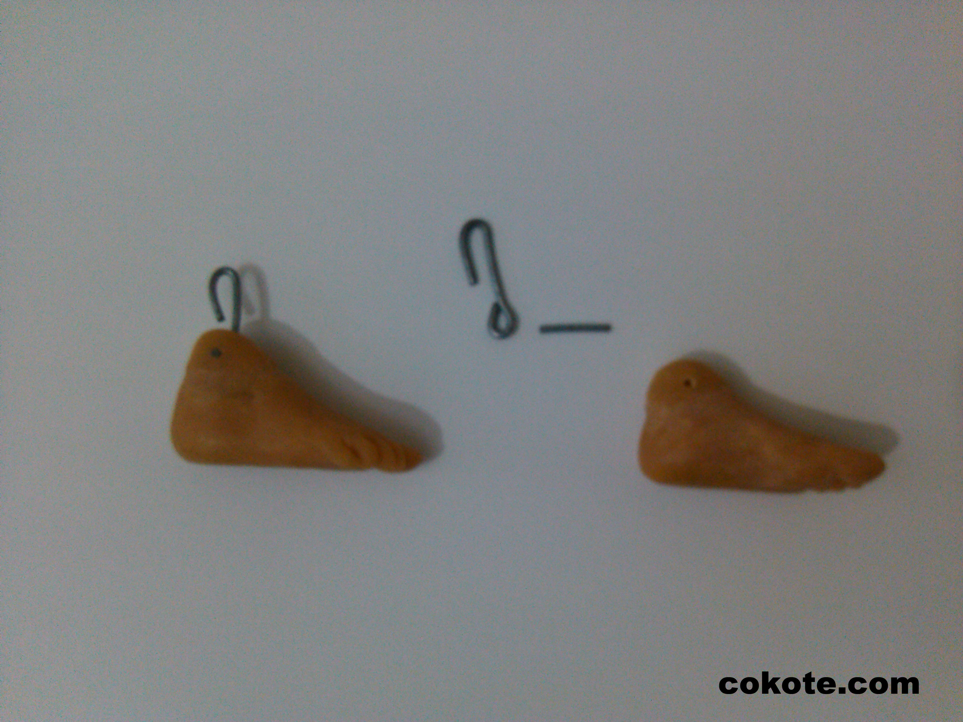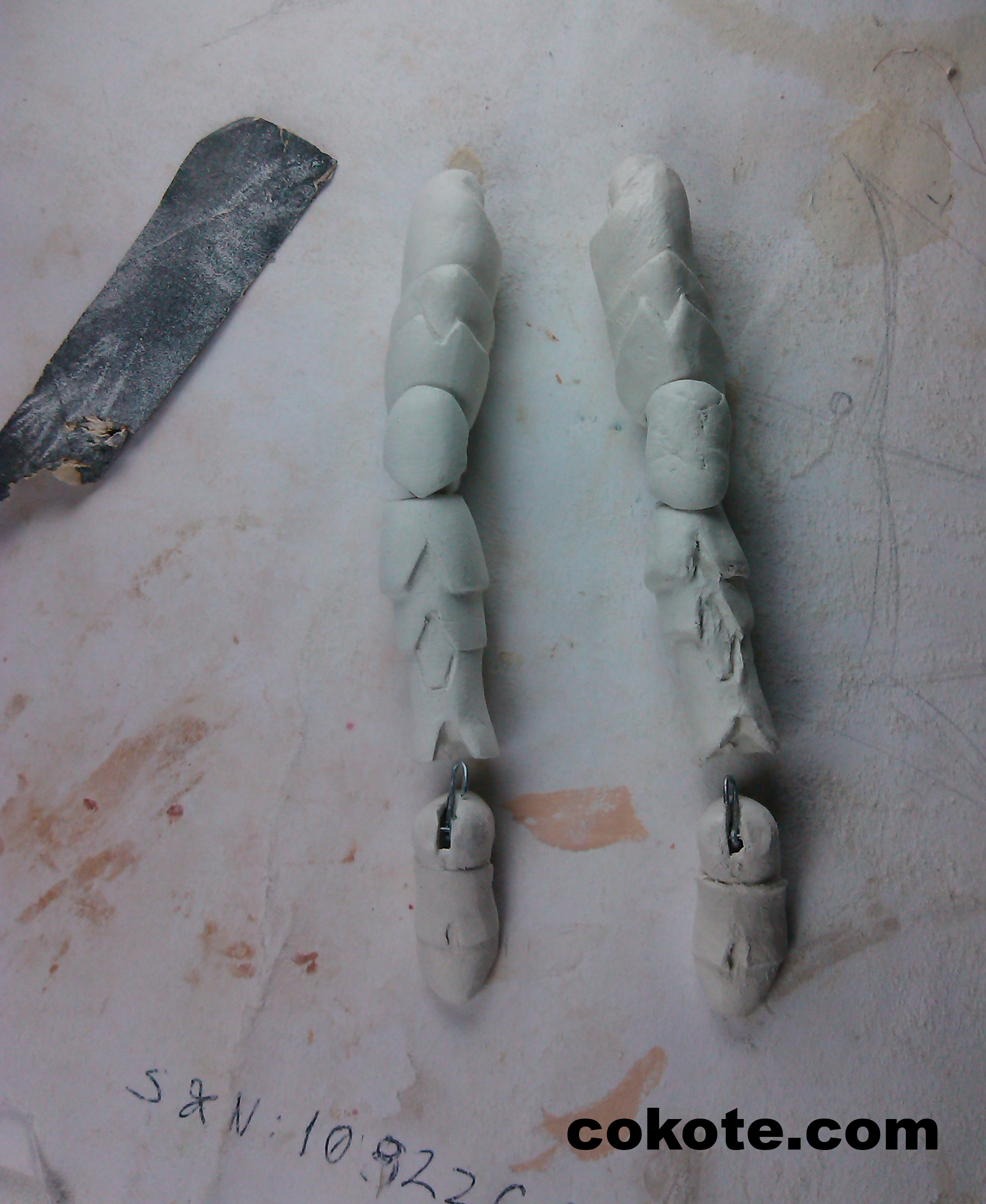 Los pies y manos los hice en bloque que posteriormente tallé, si fuera un pie descalzo, una de las mejores formas de hacerlo es modelar dedo por dedo, así como las manos, con un alambre en el interior para darle la resistencia suficiente. A estas piezas le agrego los ganchos para que sostengan los elásticos (gomas) por el interior de la pieza.