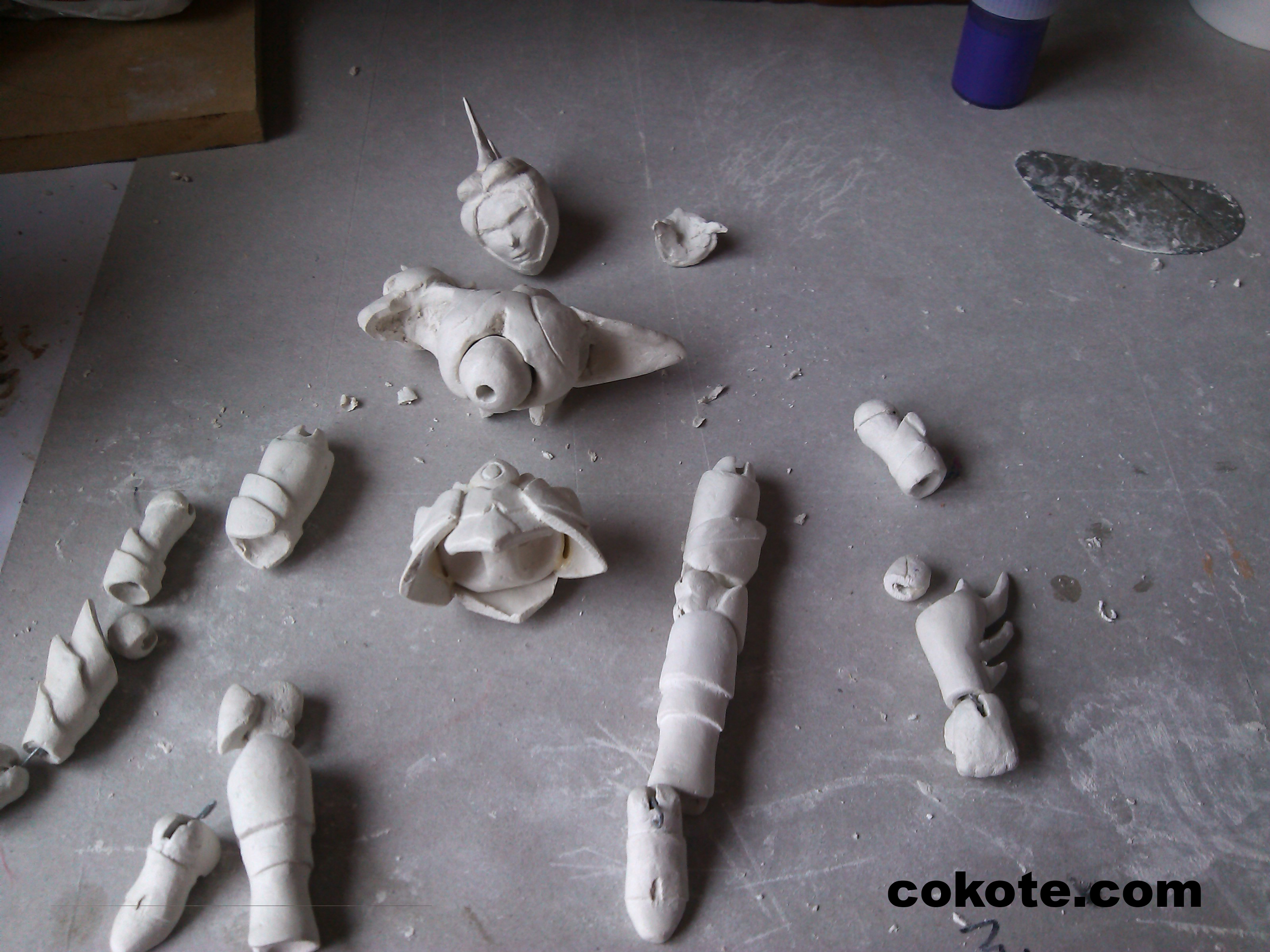 De aquí en adelante solo es ir «probando» como calzan las piezas unas con otras e ir corrigiendo las imperfecciones, antes de dar paso al modelado final, como estoy trabajando con masa das, debo esperar el tiempo necesario para que seque antes de probar como calzan las piezas, de lo contrario podrían deformarse con la presión, me preocupo de que las piezas simétricas, la partes cóncavas y convexas en verdad lo sean, me tomo mi tiempo en ello, sin prisas.