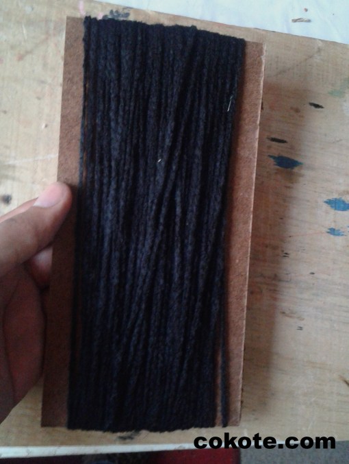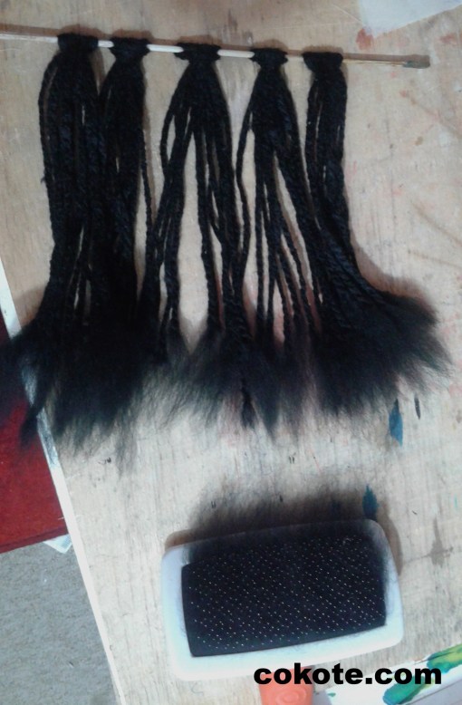 Ya con las mechas anudadas en la varilla, con el cepillo para mascotas hay que cepillar la lana desde el extremo inferior hasta el superior, suavemente, con tranquilidad, al hacerlo, el cepillo quita demasiadas fibras de la lana, es bueno de positarlas en algún lugar, deja muchas en suspención y los dientes de éste pudiera dañar la superficie sobre la cual se está trabajando, así que cuidado con eso.