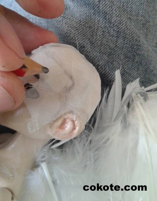 Una vez que ya está ahuecada, hago unas perforaciones a cada lado de la cabeza, un poco más arriba de la oreja, por donde paso un alambre el cual sujetará un gancho para sostener los elásticos (gomas) tal cual como en las manos y pies.
