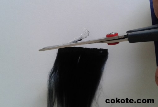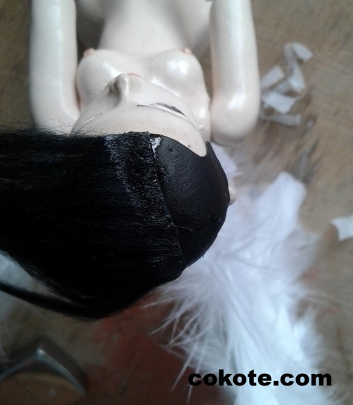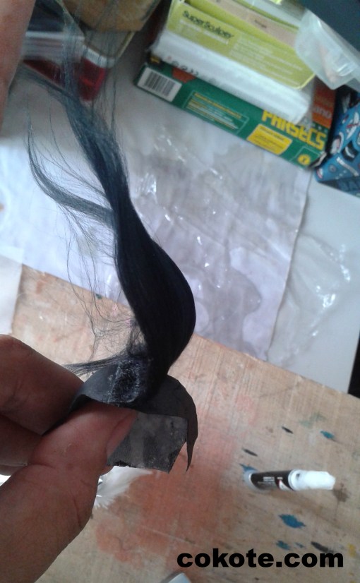 En éste caso comencé desde la parte superiror de la cabeza, pero perfectamente se puede comenzar desde la parte inferior, puse un poco de adhesivo instántaneo y pegué cruzado, en dirección al lado contrario, para hacer la «partidura» de la cabeza, doblando el mechón de pelo, sé que es confuso, pero con las imágenes queda más claro éste paso.