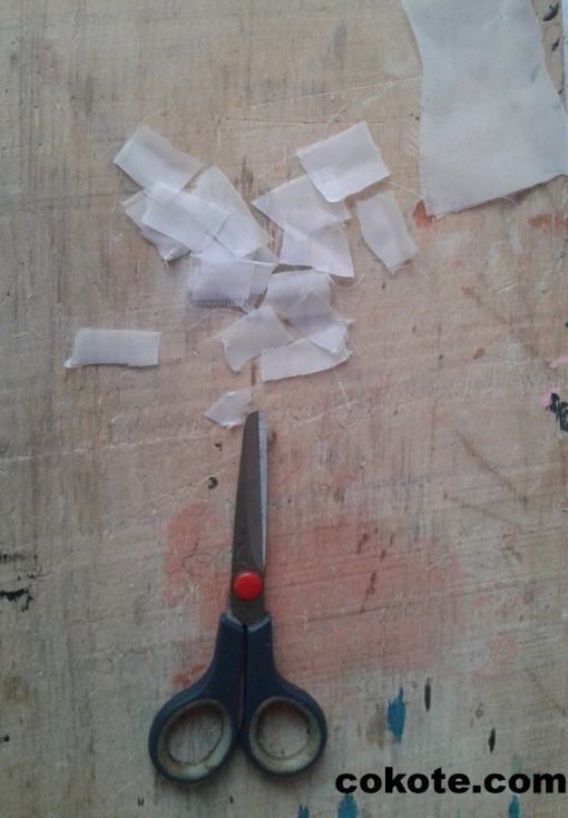 Listo esto, se cortan trozos pequeños de Tul, hay otras formas de realizar ésto, pero esta fue la que más me acomodó, la idea de esto es pegarlo sobre la superficie de la cabeza formando una gorra, que será donde se pegará el pelo de la peluca.