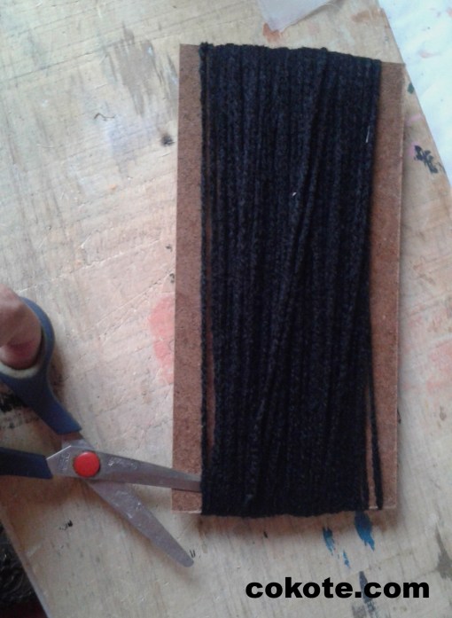 Ya listo el paso anterior, se corta la lana en uno de los extremos, en la imagen se ve que lo corté con tijeras, pero es mucho más sencillo con un cuchillo cartonero, cuter o exacto.