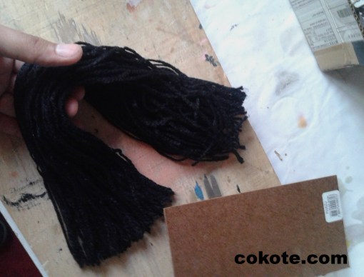Ahora se toma de entre 4 a 6 trozos de lana, los que se convertiran en mechas para la peluca, y se anudan en la varilla de ésta forma: