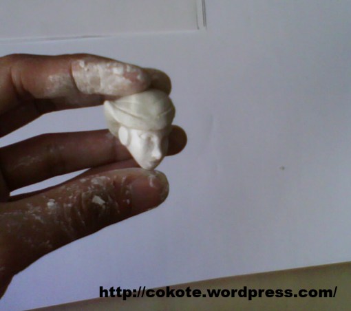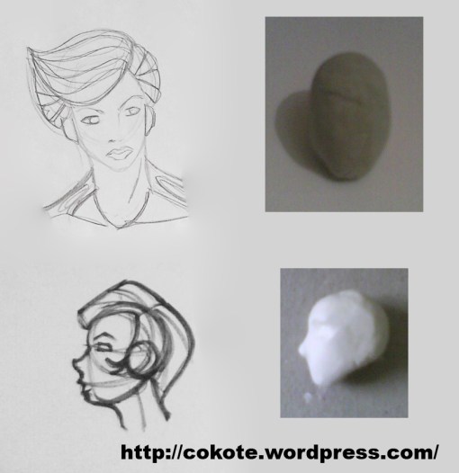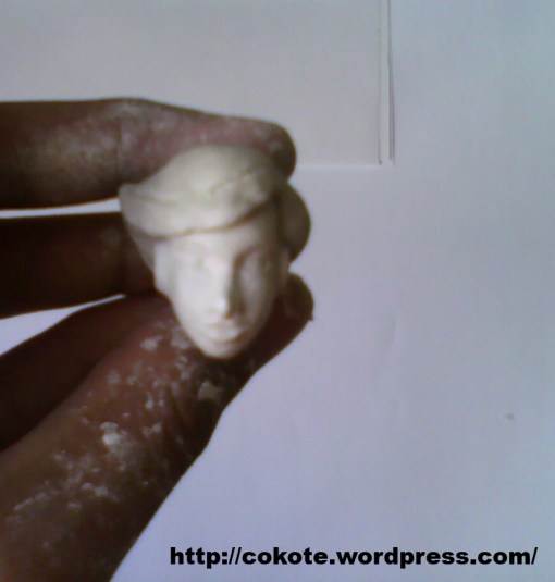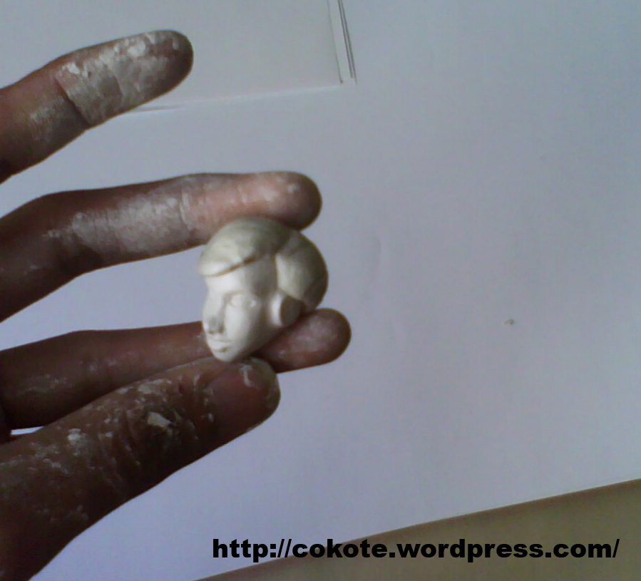 Para hacer el pelo, primero hago dos «hojas de árbol» con pasta para modelar que pego a la cabeza con abundante agua y dejo secar, cuando están bien secas corrijo los detalles, lijo, hago los surcos del peinado, agrego material donde haga falta, etc. Otra vez apegado a los bocetos jejejejeje.