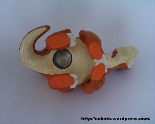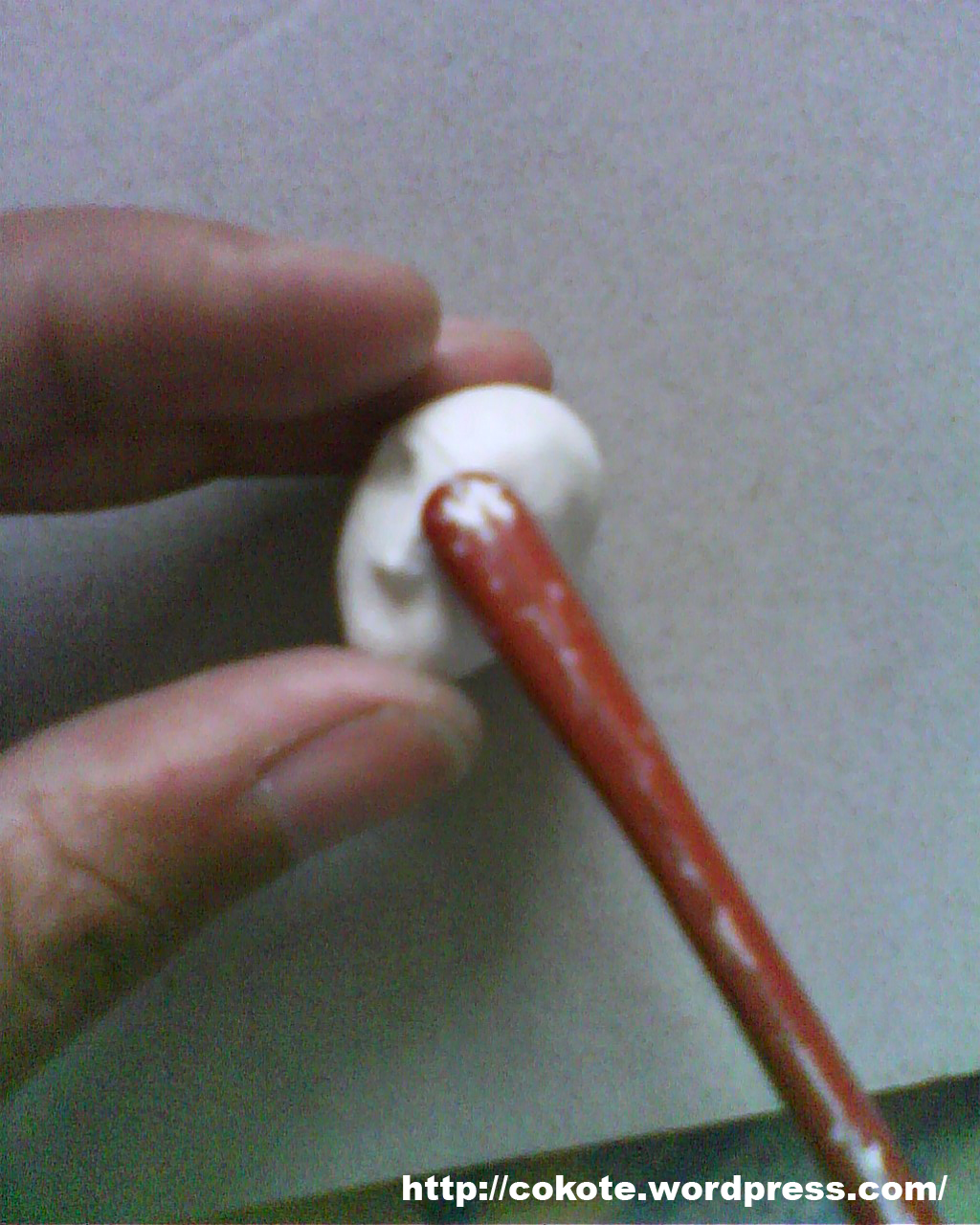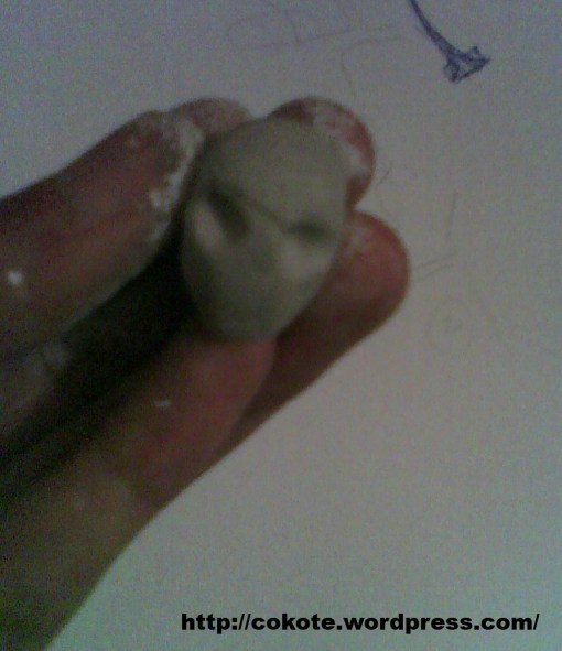 Una vez que me aseguré de que todo va bien 😀 hago las cuencas de los ojos en el cráneo, para ello utilizo la esteca «redonda» o la de tipo «Bolillo» (La primera foto es un ejemplo de como utilizo la esteca, mientras que las segunda es de como queda XD)