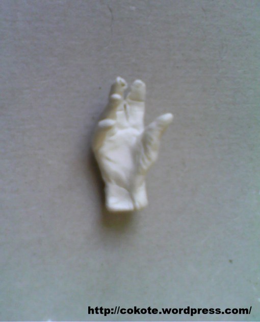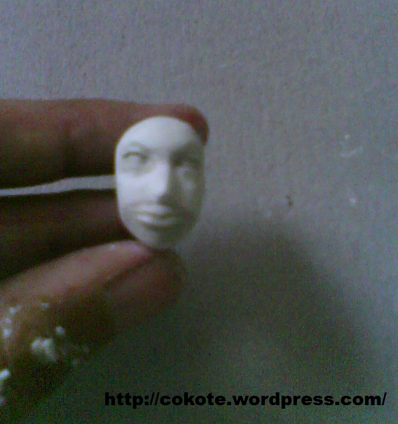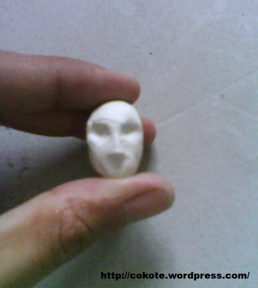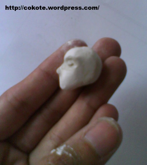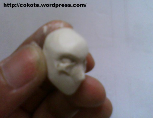 Luego de terminar de modelar la nariz, arreglo las imperfecciones, en este caso debo» agregar» pómulos y frente :). Ya que… siendo honesto, no se parece mucho al boceto de Steelheart que tengo 😛 , para los pómulos agrego pequeños «triángulitos» bajo los ojos, mientras que para la frente agrego una especie de «cintillo» o «cinta» o… ummm… «Bandana» que adhiero con abundante agua.