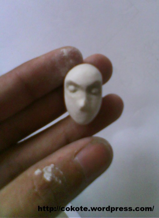 Como pequeño comentario quiero mencionar que en las fotos se puede ver la forma en «v» invertida que tienen las cejas (O donde deben ir estas mejor dicho XD) y las formé mientras lijaba. Una vez que pegué los ojos en su sitio correcto (yep! comparé de nuevo jejejeje) continuo pegando los parpados, y son estos los que finalmente le darán la forma al ojo, así que lo hago con mucho cuidado, humedeciendo un trocito de pasta para modelar con abundante agua (utilizo un pincel, funciona de maravillas XD) primero la parte inferior y luego la superior.