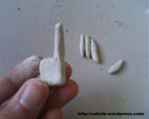 Ahora es el turno de la nariz, su forma básica está seca y dura y debo modelarla, para ello la humedezco y pego pelotitas de pasta das en los costados, básicamente se trata de un relleno y con las estecas más finas que tengo, tranquilamente le doy forma.