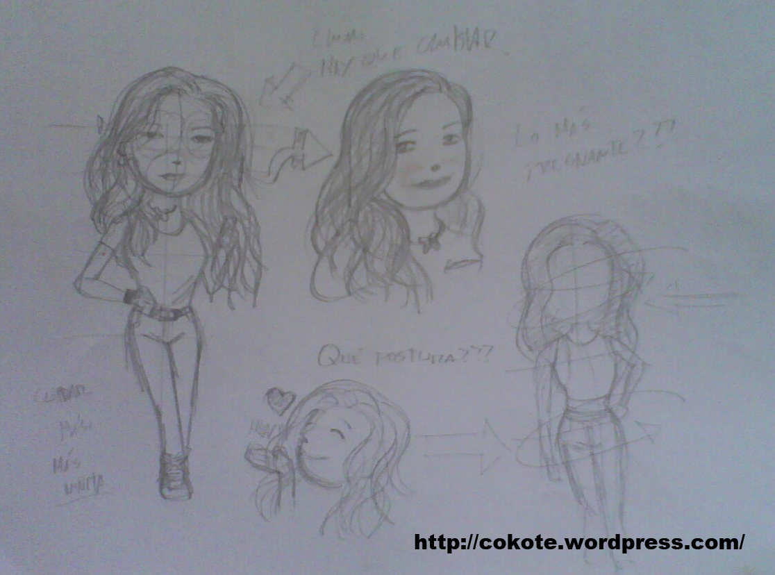 Según el boceto la forma de la cabeza es una esfera con un cono en la parte inferior formando el mentón, más o menos así.