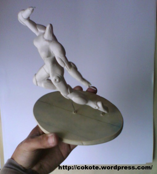 La parte más ancha de este «garrote» servirá también para modelar el trasero, ya que en este caso lo estoy usando para modelar los muslos, así que nuevamente abundante agua y mucha tranquilidad jejejejeje XD para adherirlo e ir suavizando con la esteca la superficie, hay que poner atención al espacio que existe en la entrepierna, de la misma forma que al dibujar, en esta postura es un error omitirlo, quizá esté de más mencionarlo, pero igual XD es algo que tuve en consideración al modelar.