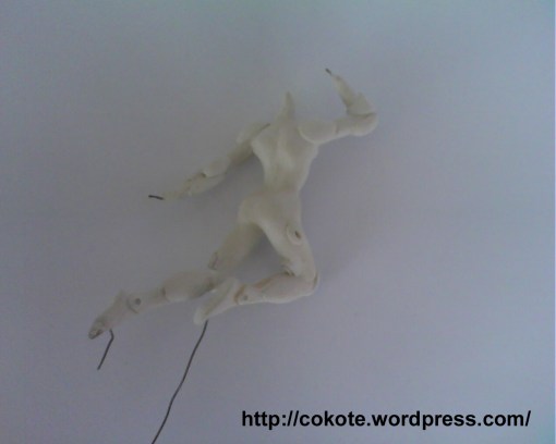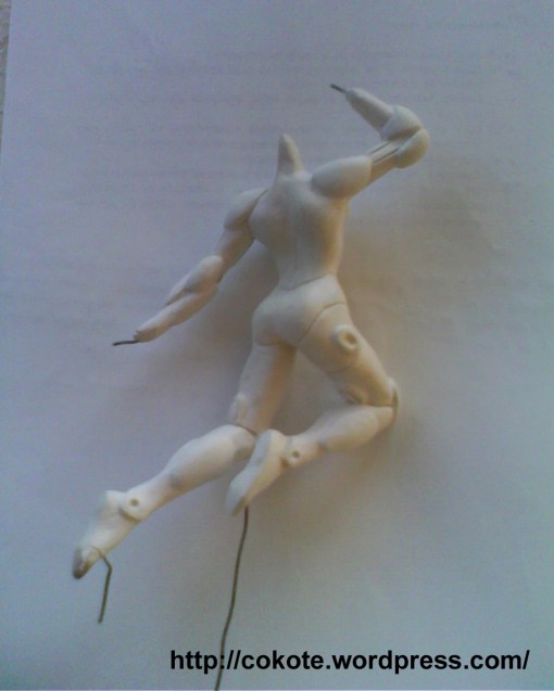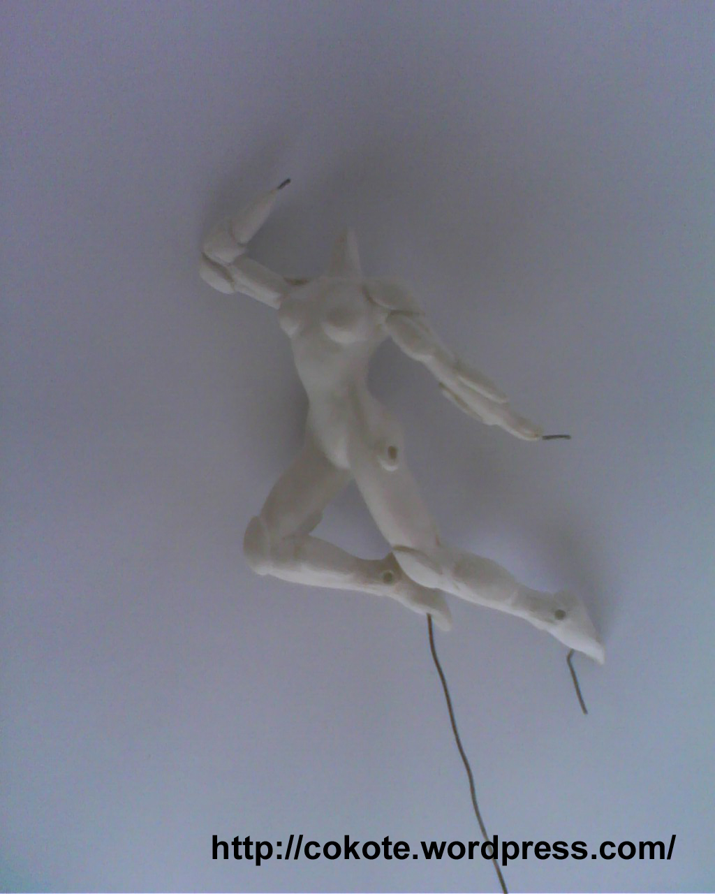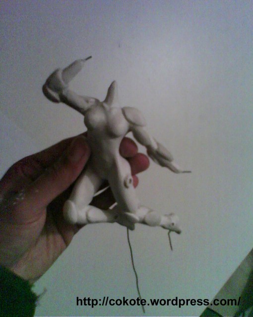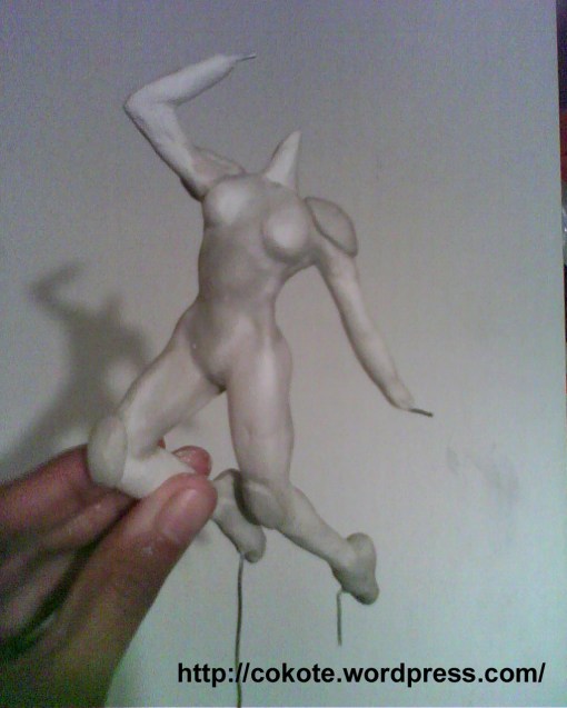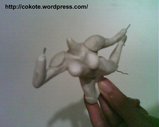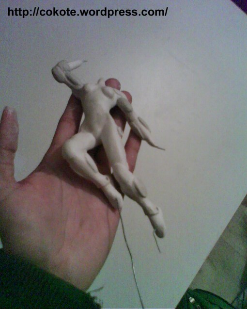 Bueno… ya está tomando forma, pero solo es su forma básica, ya que es sobre la cual trabajaré después, una vez seca. Ahora sigo con los brazos, de la misma forma que las piernas utilizo el «garrote» como base de la estructura (ya ni sé cuántas veces he escrito esa palabra XD)
