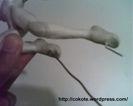 En la foto superior se ve como puse especial cuidado a las uniones de los «garrotes» en las rodillas, pues esta sección de la figura (de muchas en realidad) sufre mucho con el esfuerzo, soporta gran parte del peso y tiende a fatigarse y quebrarse, recuerden que mencioné que la pasta das puede ser quebradiza así que como las rodillas son delgadas me preocupé de que quedaran muy bien unidas y adheridas las dos secciones que la formaron.
