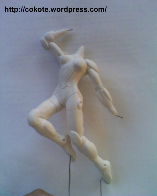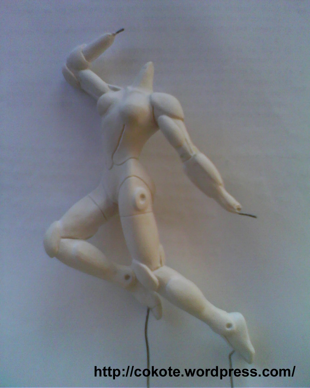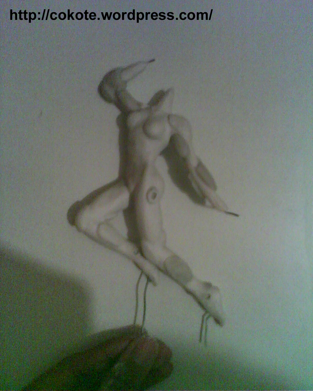 En la primera imagen se aprecia como puse especial atención en los detalles de los brazos de steelheart (ni tanto en todo caso :P) mientras que en la segunda se ve la pose de la figura, aquí me quiero detener un poco, ya había mencionado en otros posts que la composición de la figura no debe de ser aburrida, que debía «verse» interesante desde todas las vistas y que hay que prestar atención a los espacios, pues bien, también quiero recordar que también es importante que la pose de la figura sea acorde con la personalidad del personaje, suena un poco extraño lo sé, pero es similar a caracterizar un personaje, si no se posee la actitud del personaje en cuestión la caracterización pierde fuerza y credibilidad, así mismo si nuestra figura no posee la actitud del personaje también perderá fuerza, hay que tener en cuenta que el cuerpo comunica, nuestra postura corporal comunica, entonces (como ejemplo) si hago una figura de steelheart digamos… de pie, de brazos cruzados, se verá fuerte, pero estática y rígida, sin esa «gracia» (que se supone posee un halcón al volar) en cambio si la hago sobre la punta del pie y arqueada hacia atrás (como se ve en el dibujo, que está inspirado en unos bocetos que encontré) se ve más elegante, más femenina y sin esa sensación de que está estática y rígida, de seguro ahora estás pensando ¿Y la fortaleza? pues bien esa la da el «material» (de hecho la simulación de este) pues al pintarla de un plateado metálico, inmediatamente le vas a dar fortaleza… así la figura se verá con gracia y fuerza ¿se entiende, no? Este es un punto que en lo personal me da mucho trabajo, pero que se soluciona sin mayores inconvenientes, ahora no resulta muy difícil conseguir una buena y potente imagen de la figura que deseamos realizar, ahora si uno desea experimentar una víctim…  amigo(a) o novio(a) con dotes de actor o mucha personalidad y buen humor y una buena cámara digital nos solucionan la vida 😉