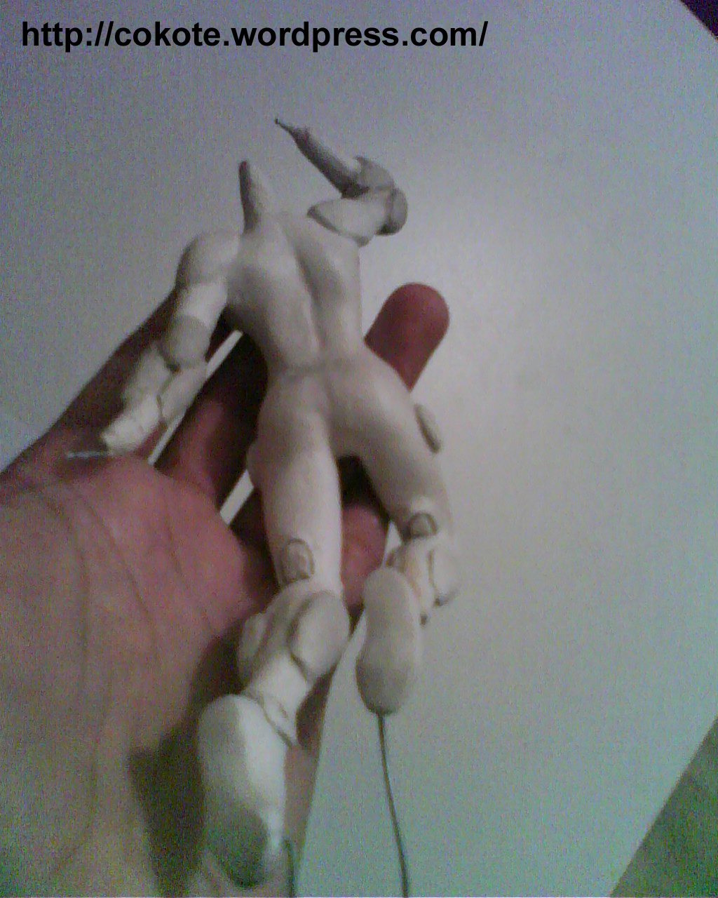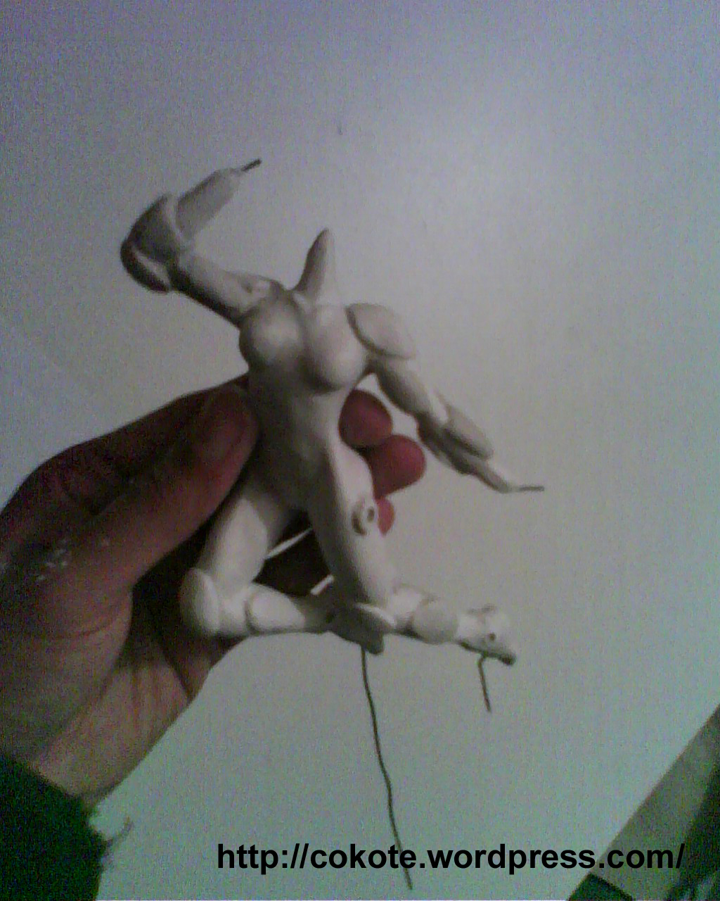 En la foto se ve el como adherí más material en el abdomen, las rodilleras, las hombreras y los pies, así como los huesos de la cadera (me detuve un poco en ellos XD) para ello humedecí previamente la figura, con un pincel y abundante agua, para que la pasta se pegara con facilidad, luego se deja secar, pacientemente :).